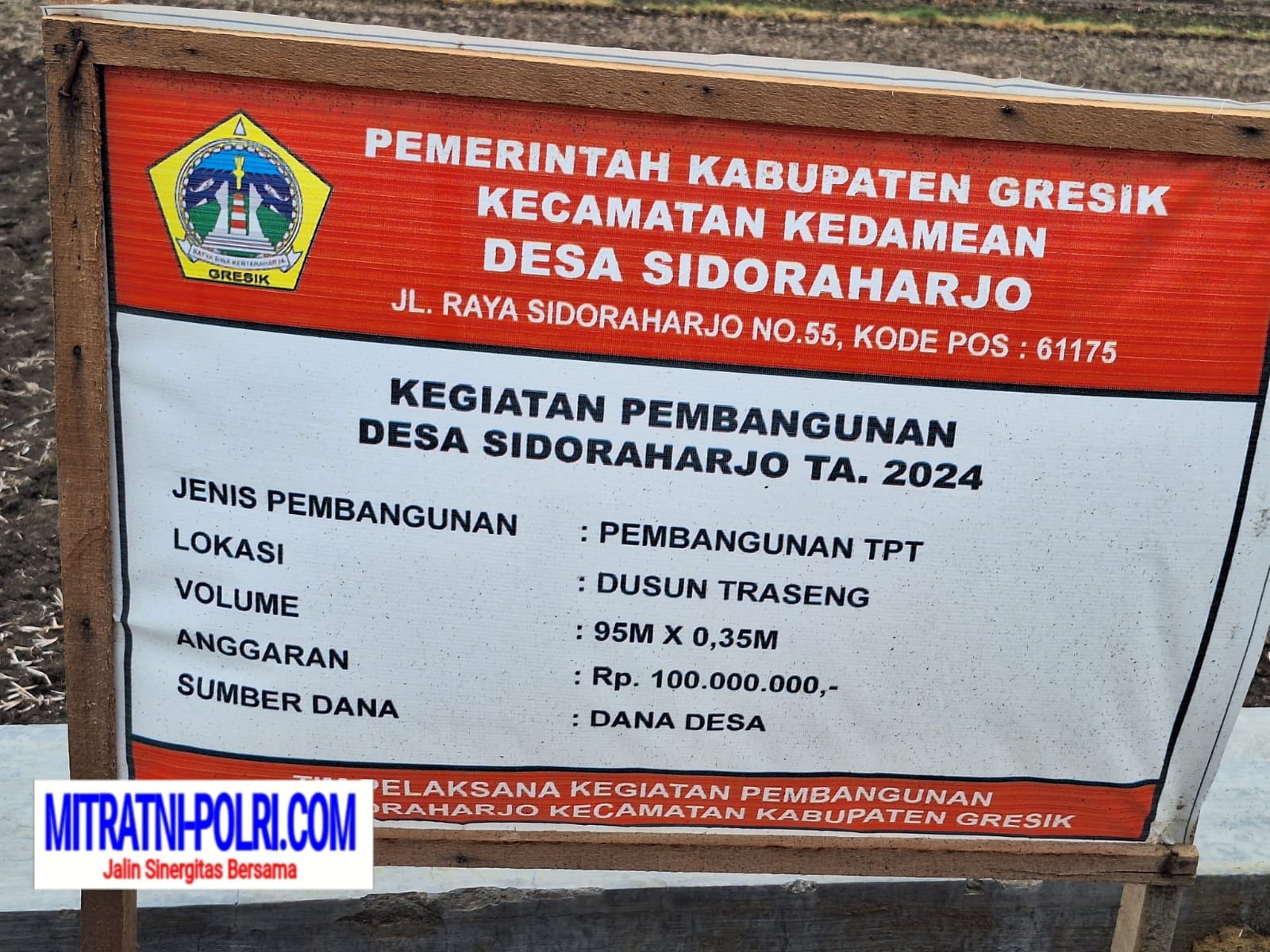 Pengerjaan TPT ( tembok penahan tanah ) yang terletak di Dusun Traseng Desa Sidoraharjo Kecamatan Kedamean Kabupaten Gresik patut di soroti.
