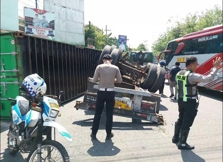 Sebuah truk kontainer bermuatan kayu lapis terguling di Simpang Empat Sambongdukuh, Kabupaten Jombang, Selasa (14/10/2025) pagi.
