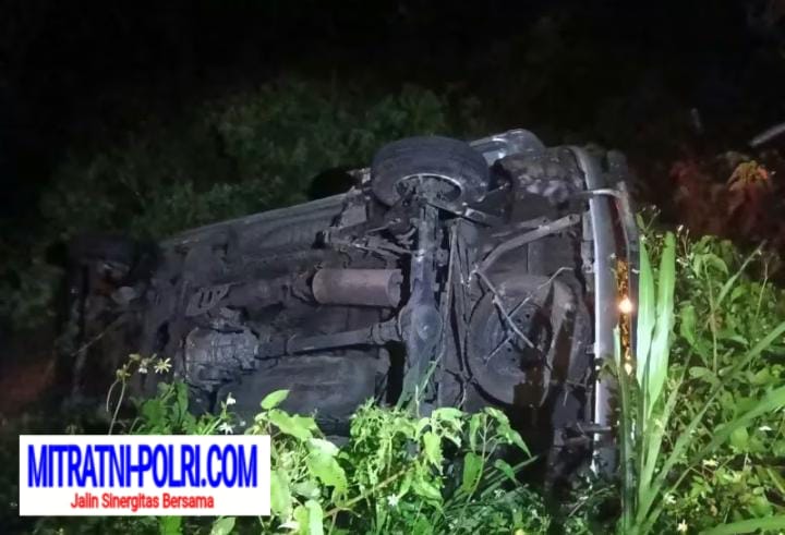 Sebuah mobil Daihatsu Gran Max terguling dan nyemplung ke kali di tepi Jalan Raya Desa Wringinrejo, Kecamatan Sooko, Rabu (23/10) malam. Itu setelah mobil menghantam sebuah hand tractor yang sedang mengaspal usai dipakai menggarap sawah.