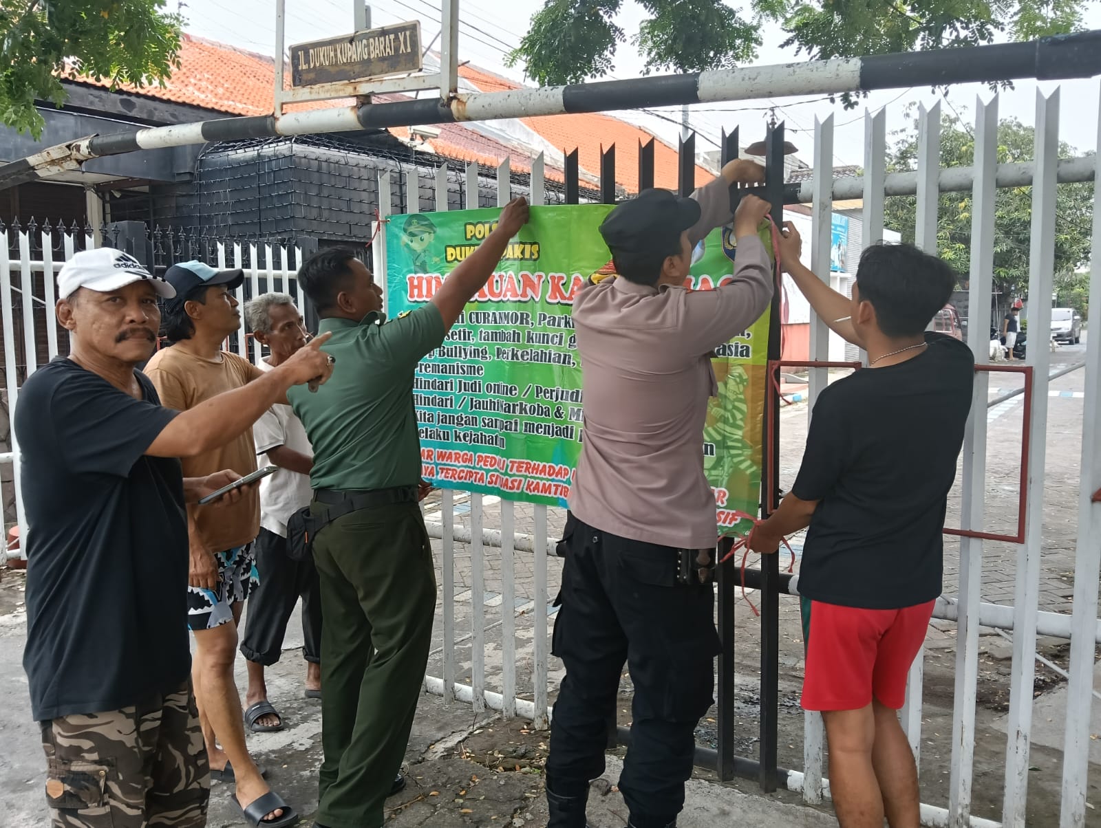 Bhabinkamtibmas Kelurahan Dukuh Kupang bersama Babinsa serta tokoh masyarakat, Ketua RT 2 dan Ketua RW 4 Dukuh Kupang Barat XI, melaksanakan kegiatan pemasangan spanduk imbauan Kamtibmas kepada warga.
