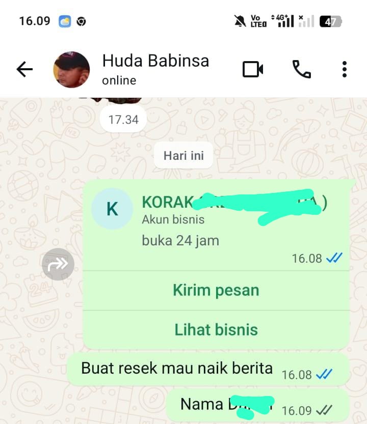 H menhubungi Babinsa Metatu inisial H terkait galian dengan sebuah pesan ke Babinsa ” Ini Namanya…bikin resek mau naikin berita ,’ pesan H lewat sebuah Chat WhatsApp.